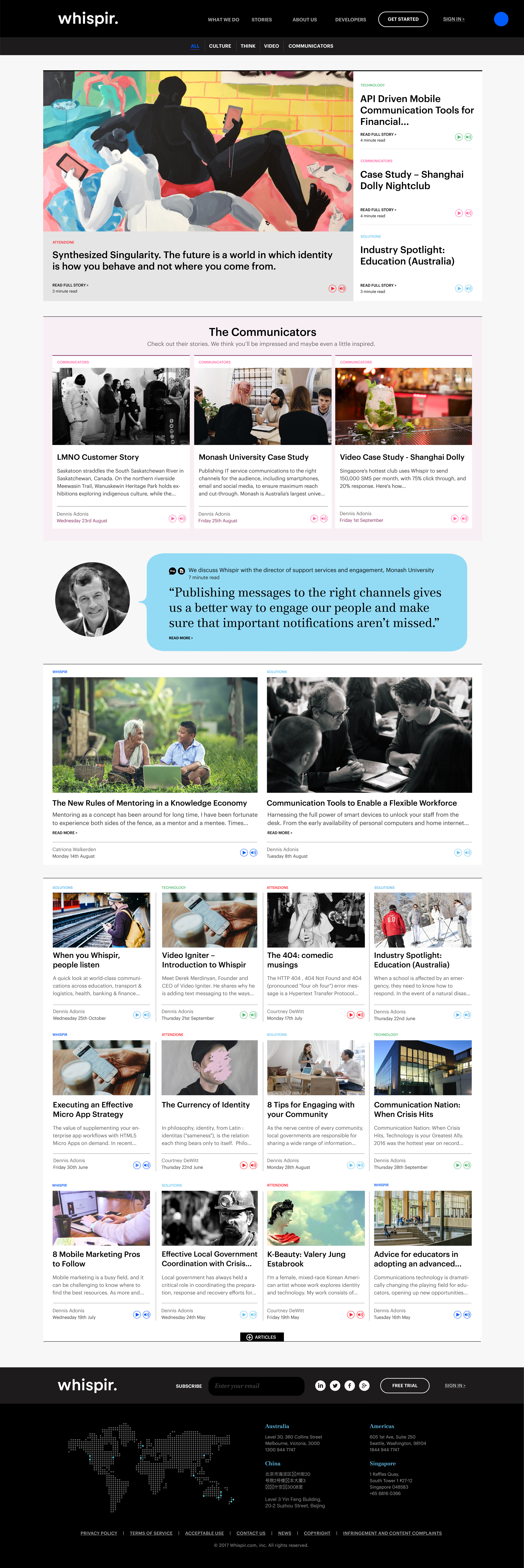 After establishing a new identity system for Whispir, the Marketing team reached out to Carlos at Journey Studio, to design a fresh new homepage and a set of character illustrations for us. I was responsible for rolling out this new visual identity across all of Whispir’s internal and external digital and print communications.